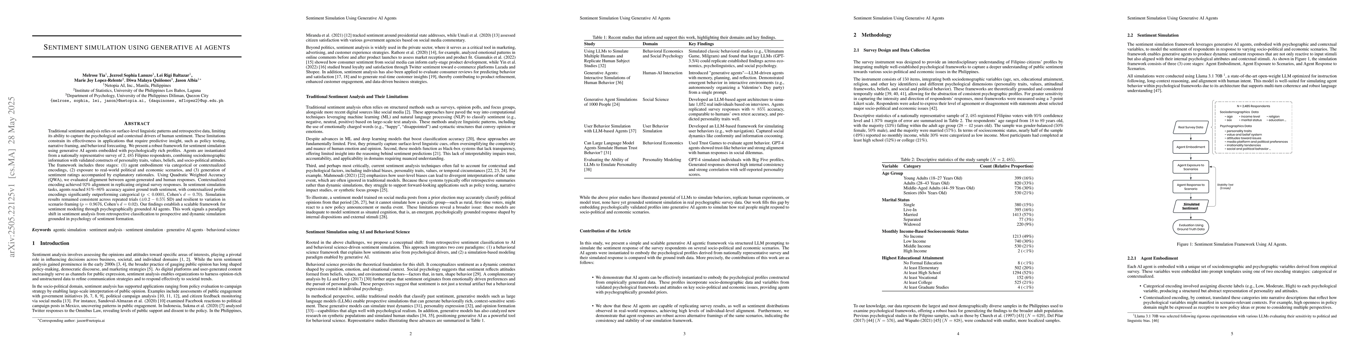 Traditional sentiment analysis relies on surface-level linguistic patterns and retrospective data, limiting its ability to capture the psychological and contextual drivers of human sentiment. These limitations constrain its effectiveness in applications that require predictive insight, such as policy testing, narrative framing, and behavioral forecasting. We present a robust framework for sentiment simulation using generative AI agents embedded with psychologically rich profiles. Agents are instantiated from a nationally representative survey of 2,485 Filipino respondents, combining sociodemographic information with validated constructs of personality traits, values, beliefs, and socio-political attitudes. The framework includes three stages: (1) agent embodiment via categorical or contextualized encodings, (2) exposure to real-world political and economic scenarios, and (3) generation of sentiment ratings accompanied by explanatory rationales. Using Quadratic Weighted Accuracy (QWA), we evaluated alignment between agent-generated and human responses. Contextualized encoding achieved 92% alignment in replicating original survey responses. In sentiment simulation tasks, agents reached 81%--86% accuracy against ground truth sentiment, with contextualized profile encodings significantly outperforming categorical (p < 0.0001, Cohen's d = 0.70). Simulation results remained consistent across repeated trials (+/-0.2--0.5% SD) and resilient to variation in scenario framing (p = 0.9676, Cohen's d = 0.02). Our findings establish a scalable framework for sentiment modeling through psychographically grounded AI agents. This work signals a paradigm shift in sentiment analysis from retrospective classification to prospective and dynamic simulation grounded in psychology of sentiment formation.