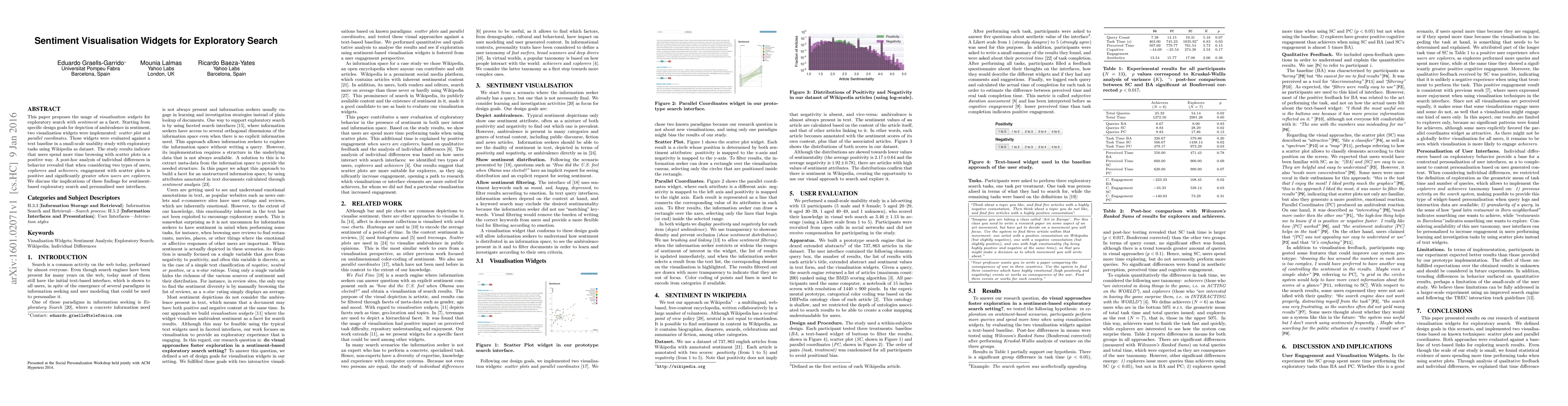 This paper proposes the usage of \emph{visualisation widgets} for exploratory search with \emph{sentiment} as a facet. Starting from specific design goals for depiction of ambivalence in sentiment, two visualization widgets were implemented: \emph{scatter plot} and \emph{parallel coordinates}. Those widgets were evaluated against a text baseline in a small-scale usability study with exploratory tasks using Wikipedia as dataset. The study results indicate that users spend more time browsing with scatter plots in a positive way. A post-hoc analysis of individual differences in behavior revealed that when considering two types of users, \emph{explorers} and \emph{achievers}, engagement with scatter plots is positive and significantly greater \textit{when users are explorers}. We discuss the implications of these findings for sentiment-based exploratory search and personalised user interfaces.