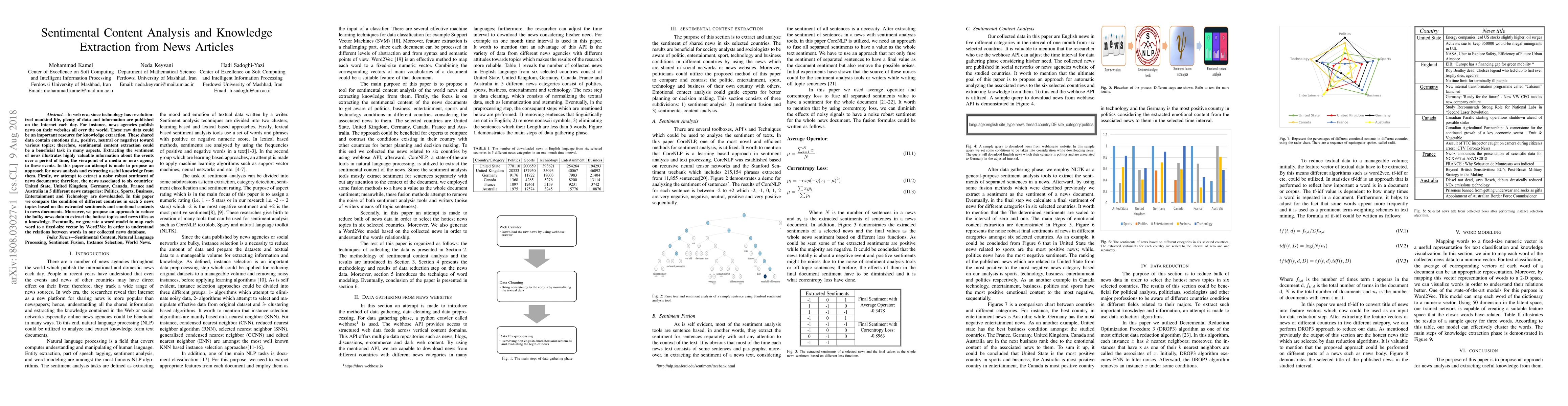 This paper proposes a method for analyzing sentimental content in news articles and extracting valuable knowledge from them. It focuses on sentiment extraction from news articles across six countries and five categories, comparing sentiments and identifying key topics, while utilizing Word2Vec to model word relationships.