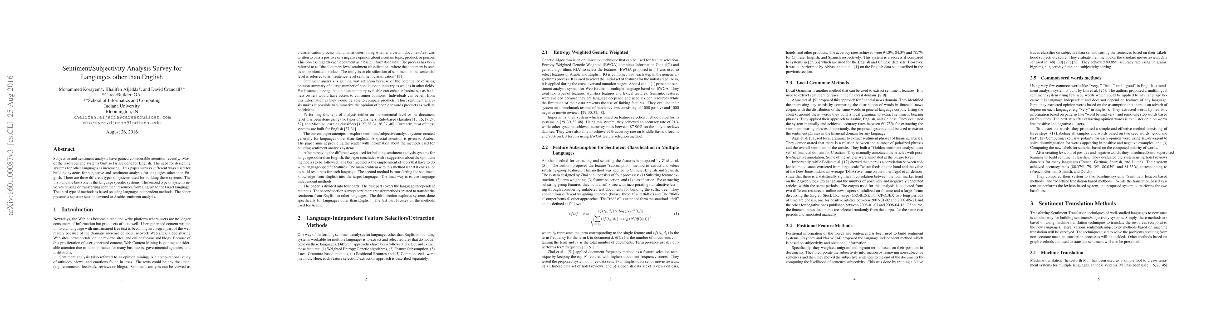 This paper surveys methods for subjective and sentiment analysis in languages other than English, categorizing them into language-specific systems, resource transfer from English, and language-independent methods. It also highlights specific approaches for Arabic sentiment analysis.