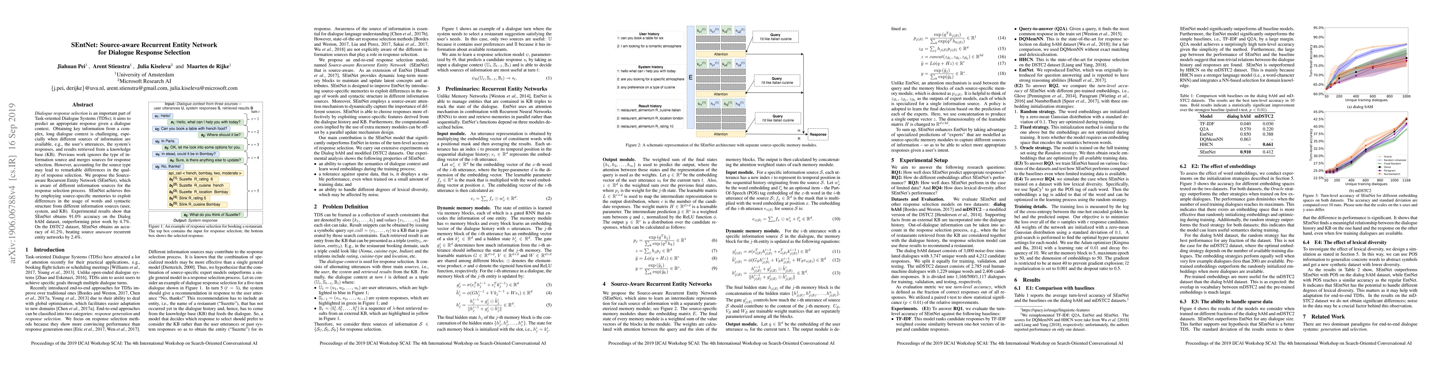 SEntNet is a Source-aware Recurrent Entity Network designed for dialogue response selection in Task-oriented Dialogue Systems. It uses source-specific memories to differentiate between user, system, and knowledge base information, achieving higher accuracy compared to source-agnostic models.