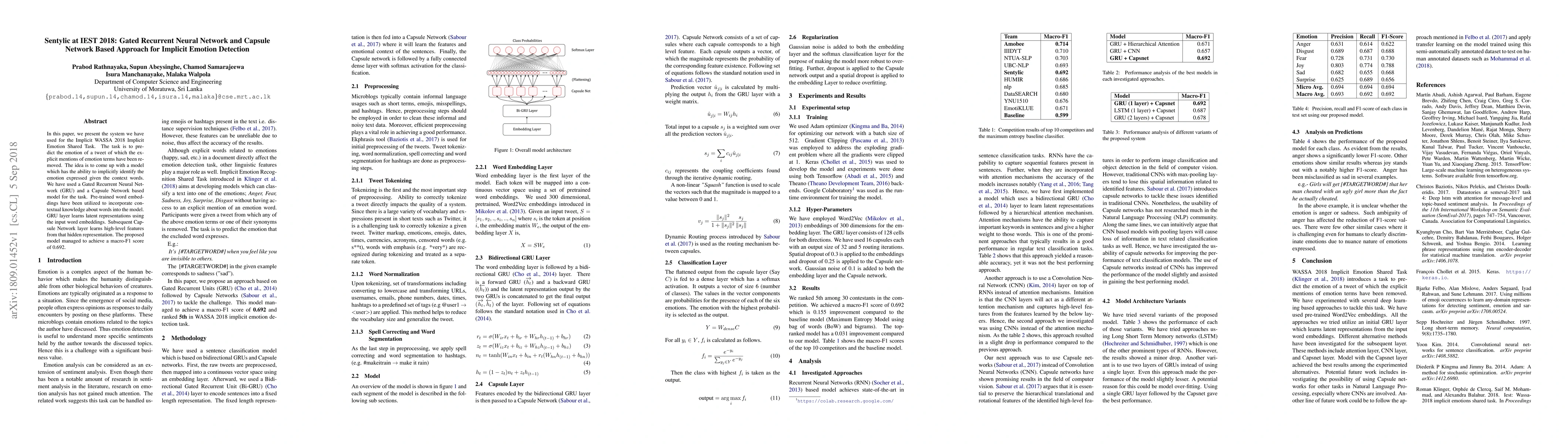 This paper presents a GRU and Capsule Network-based model for detecting implicit emotions in tweets without explicit emotion terms. The model uses pre-trained word embeddings and achieved a macro-F1 score of 0.692 in the Implicit WASSA 2018 task.