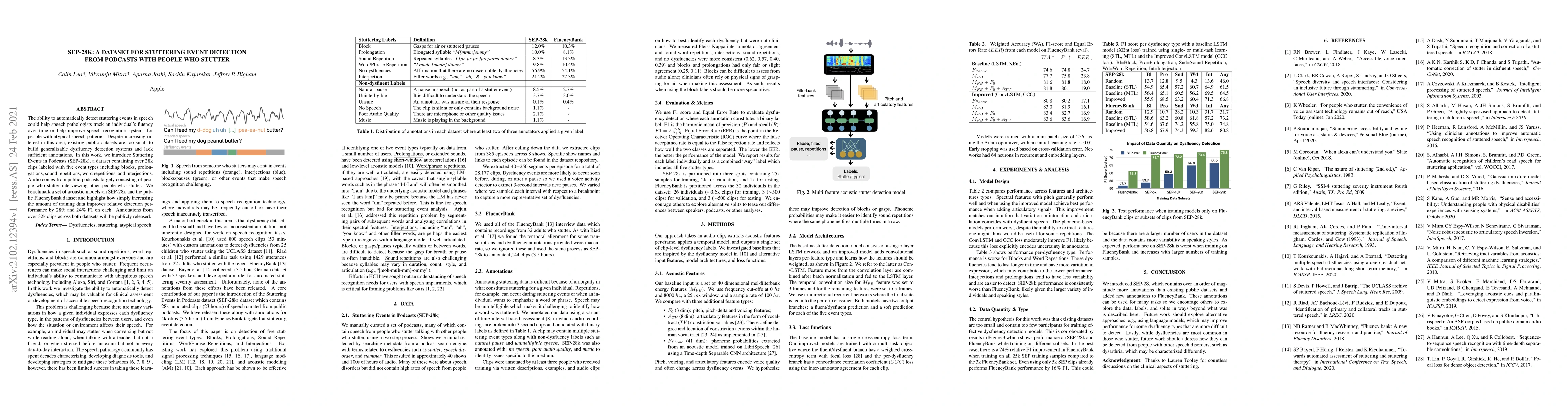 The paper presents SEP-28k, a significantly larger dataset with detailed annotations, and investigates various acoustic features, model architectures, and loss functions for stuttering event detection.