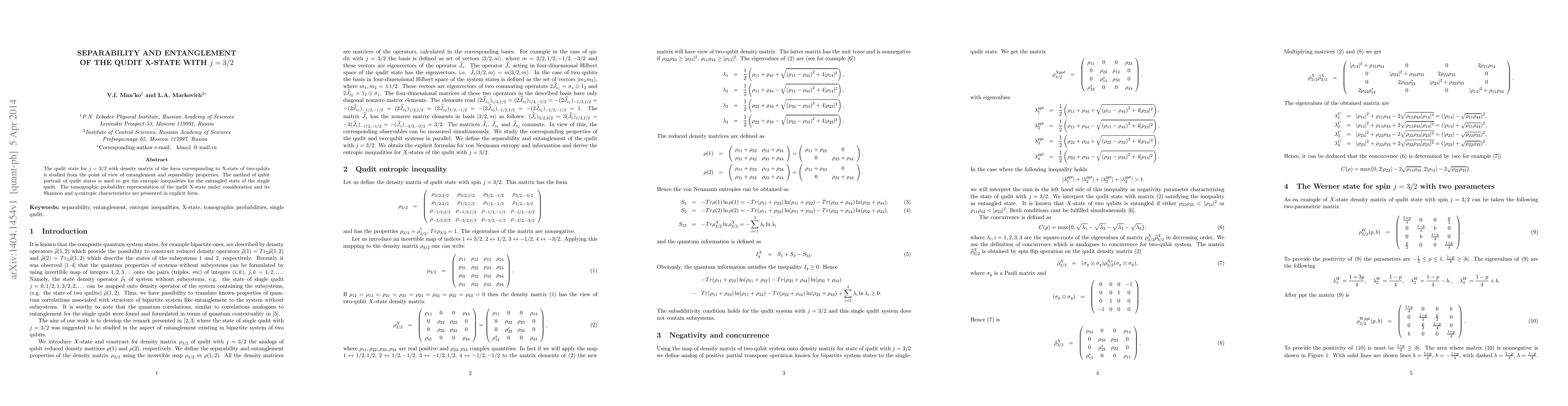 The qudit state for j = 3=2 with density matrix of the form corresponding to X-state of two-qubits is studied from the point of view of entanglement and separability properties. The method of qubit portrait of qudit states is used to get the entropic inequalities for the entangled state of the single qudit. The tomographic probability representation of the qudit X-state under consideration and its Shannon and q-entropic characteristics are presented in explicit form.