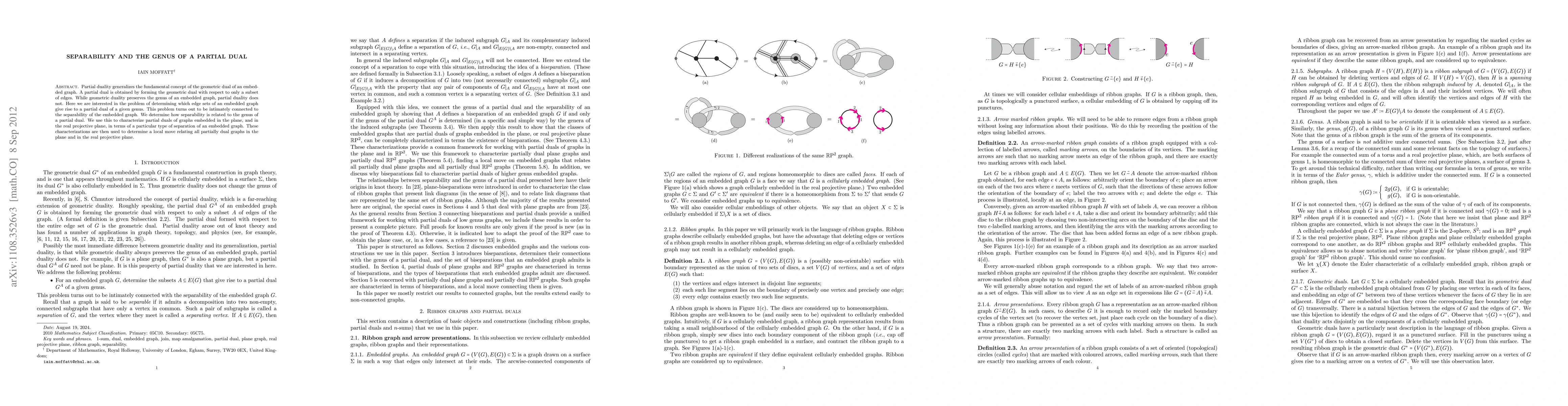 This paper investigates the relationship between separability and the genus of partial duals of embedded graphs, showing that separability determines which edge subsets yield partial duals of a given genus. It also characterizes partial duals in the plane and the real projective plane based on graph separation, leading to a local move connecting all such duals.