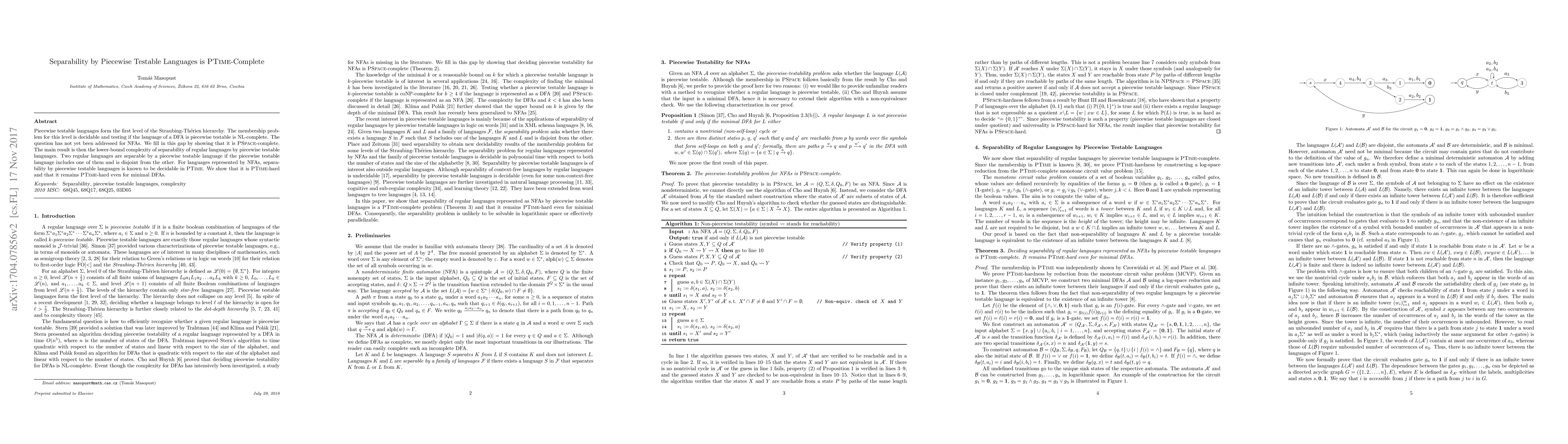 The paper establishes that separability of regular languages by piecewise testable languages, when represented by NFAs, is PTime-complete. It demonstrates that this problem remains PTime-hard even when considering minimal DFAs.