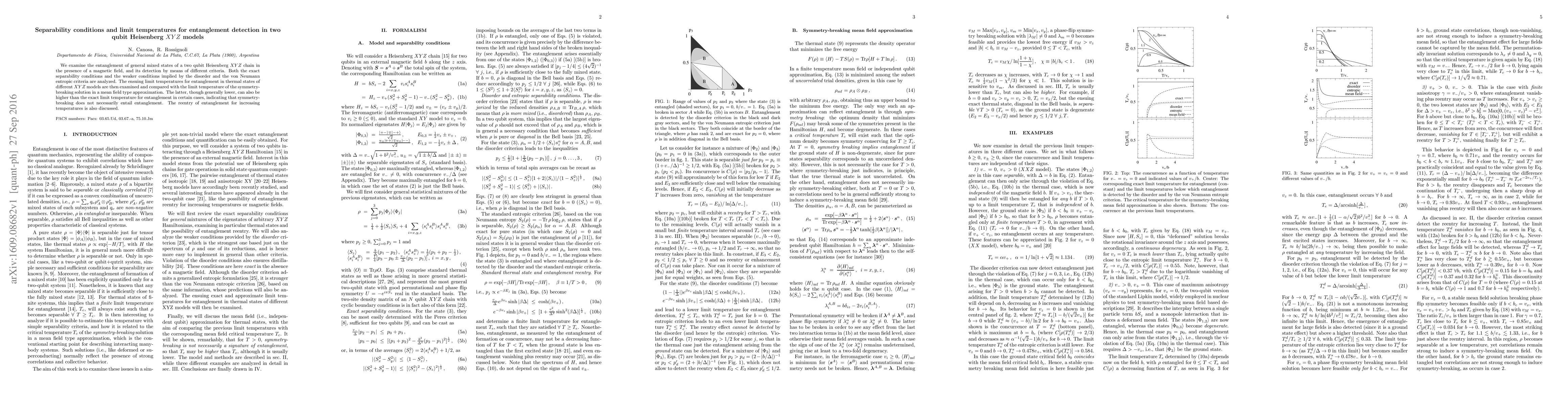 We examine the entanglement of general mixed states of a two qubit Heisenberg XYZ chain in the presence of a magnetic field, and its detection by means of different criteria. Both the exact separability conditions and the weaker conditions implied by the disorder and the von Neumann entropic criteria are analyzed. The ensuing limit temperatures for entanglement in thermal states of different XYZ models are then examined and compared with the limit temperature of the symmetry-breaking solution in a mean field type approximation. The latter, though generally lower, can also be higher than the exact limit temperature for entanglement in certain cases, indicating that symmetry-breaking does not necessarily entail entanglement. The reentry of entanglement for increasing temperatures is also discussed.