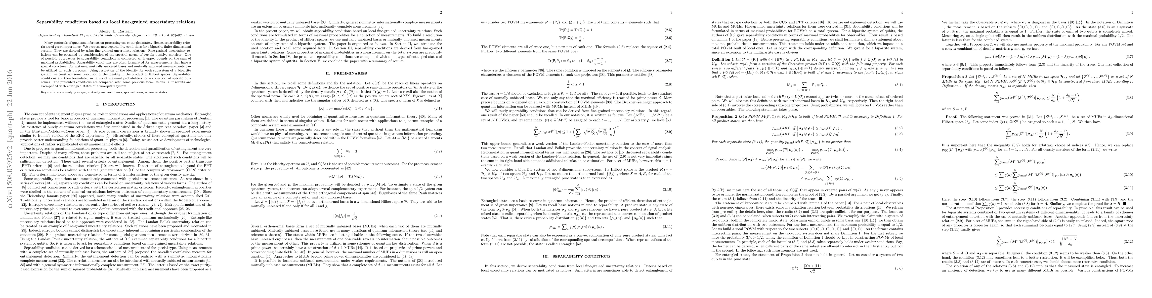 Many protocols of quantum information processing use entangled states. Hence, separability criteria are of great importance. We propose new separability conditions for a bipartite finite-dimensional system. They are derived by using fine-grained uncertainty relations. Fine-grained uncertainty relations can be obtained by consideration of the spectral norms of certain positive matrices. One of possible approaches to separability conditions is connected with upper bounds on the sum of maximal probabilities. Separability conditions are often formulated for measurements that have a special structure. For instance, mutually unbiased bases and mutually unbiased measurements can be utilized for such purposes. Using resolution of the identity for each subsystem of a bipartite system, we construct some resolution of the identity in the product of Hilbert spaces. Separability conditions are then formulated in terms of maximal probabilities for a collection of specific outcomes. The presented conditions are compared with some previous formulations. Our results are exemplified with entangled states of a two-qutrit system.