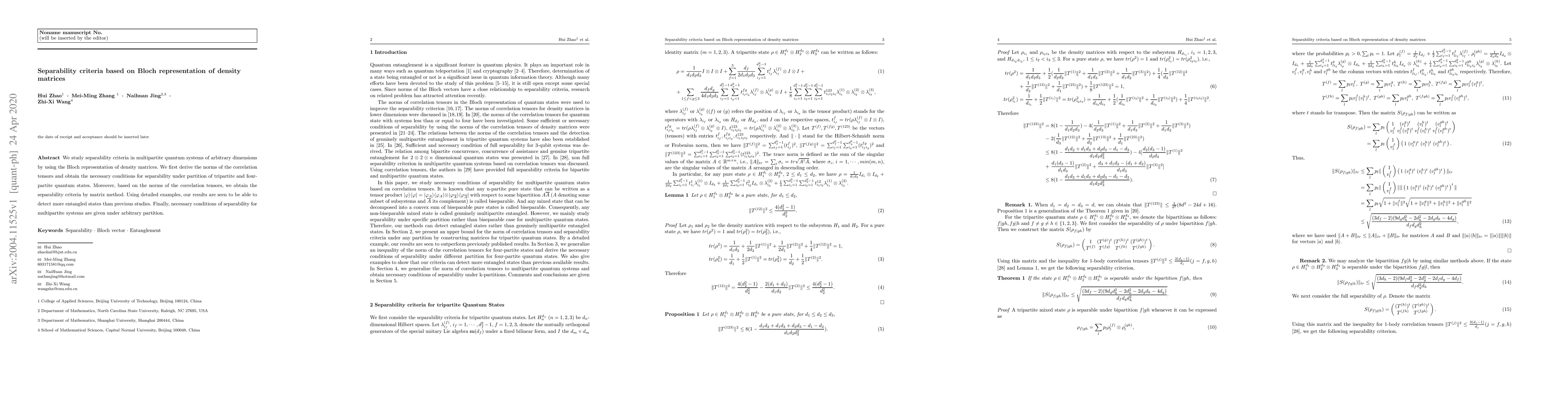 This paper develops separability criteria for multipartite quantum systems using the Bloch representation of density matrices, deriving norms of correlation tensors and presenting necessary conditions for tripartite and four-partite states. The proposed matrix method enhances the detection of entangled states compared to previous methods.