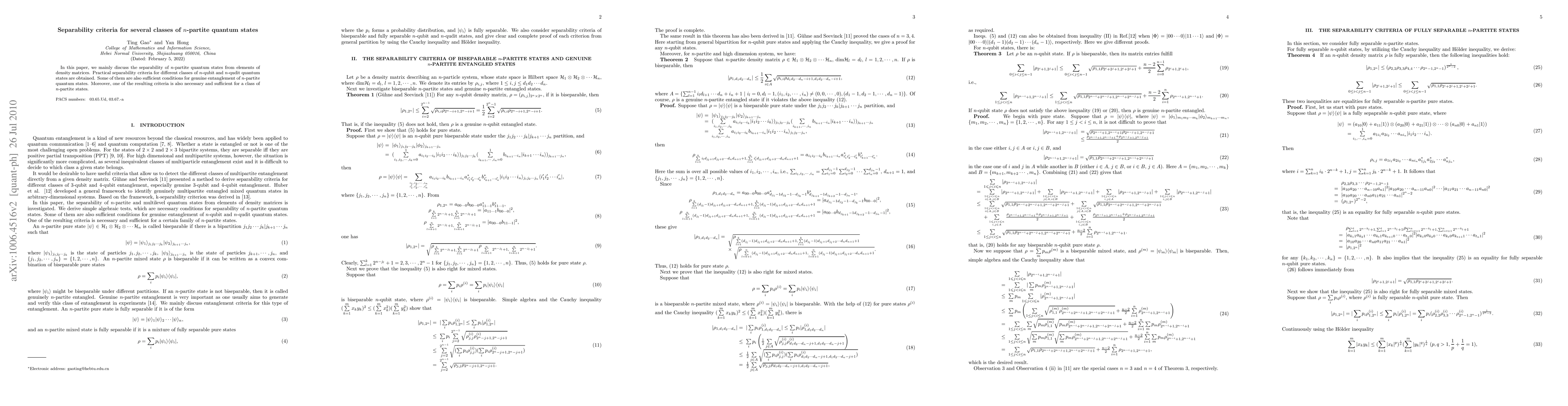 This paper develops practical separability criteria for various classes of $n$-partite quantum states, including $n$-qubit and $n$-qudit systems, and identifies some as sufficient conditions for genuine entanglement, with one criterion being both necessary and sufficient for a specific class.