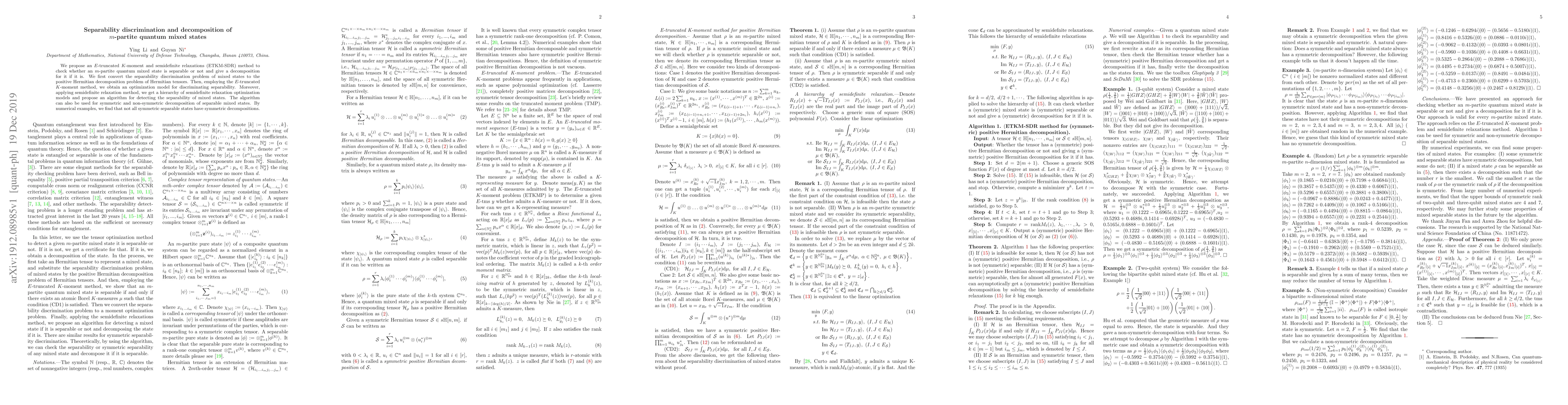 This paper proposes a tensor optimization method for determining the separability of $m$-partite quantum mixed states using an ETKM-SDR algorithm, which involves converting the problem into a Hermitian decomposition and employing semidefinite relaxations. It also reveals that symmetric separable states do not always have symmetric decompositions.