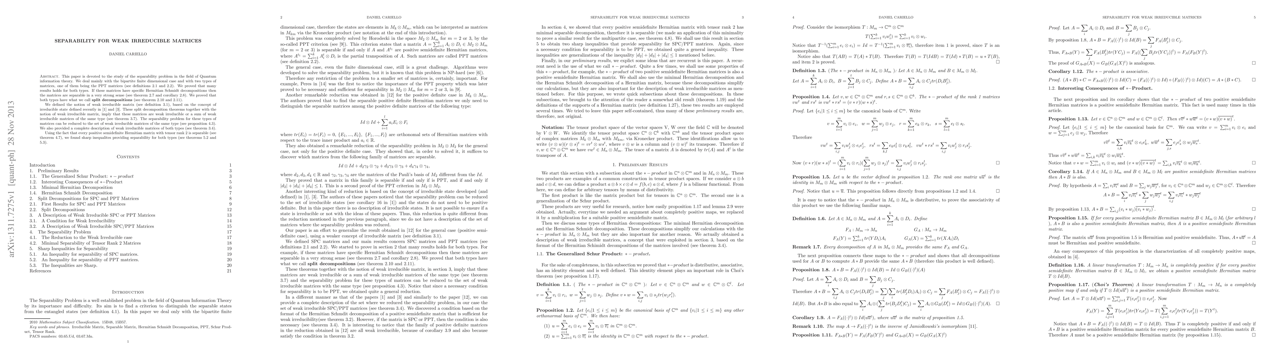 This paper investigates the separability problem for weak irreducible matrices in quantum information theory, proving that specific Hermitian Schmidt decompositions lead to strong separability. It introduces split decompositions and weak irreducible matrices, reducing the separability problem to these matrices and providing a complete description of them.