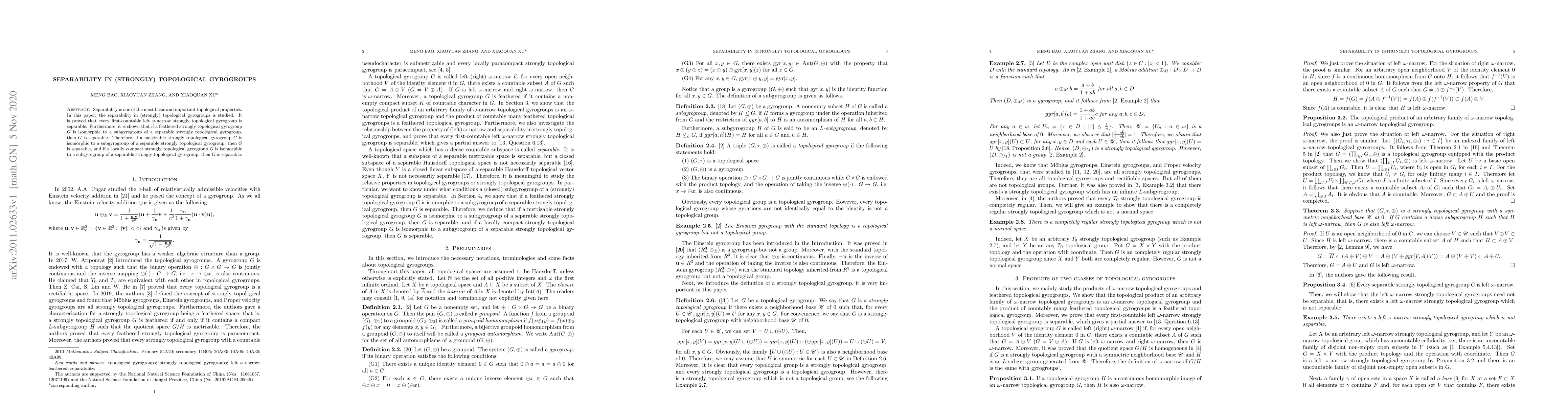 This paper investigates separability in (strongly) topological gyrogroups, proving that first-countable left ω-narrow strongly topological gyrogroups are separable. It also demonstrates that feathered strongly topological gyrogroups isomorphic to subgyrogroups of separable ones are separable, extending this result to metrizable and locally compact cases.