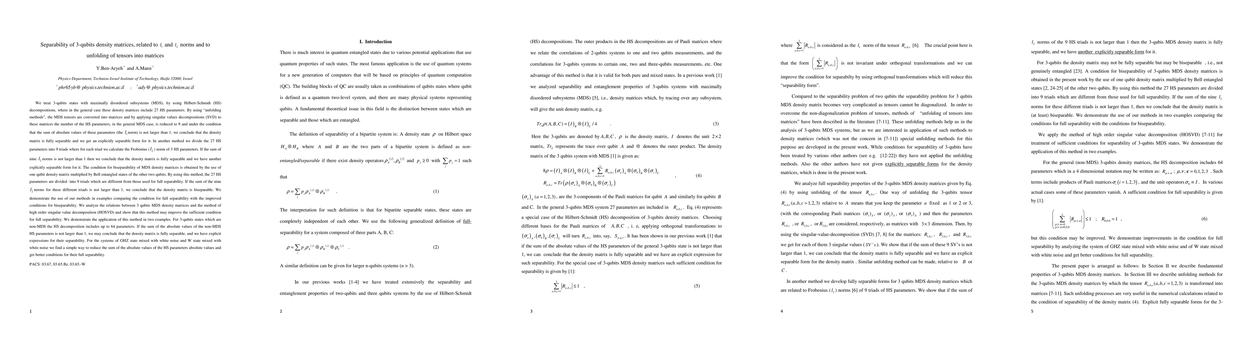 We treat 3-qubits states with maximally disordered subsystems, by using Hilbert-Schmidt decompositions.By using unfolding methods, the tensors are converted into matrices and by applying singular values decompositions to these matrices the number 27 of the Hilbert Schmidt parameters, is reduced to 9 and under the condition that the sum of absolute values of these parameters is not larger than 1, we conclude that the density matrix is fully separable . In another method we divide the 27 Hilbert Schmidt parameters into 9 triads where for each triad we calculate the Frobenius norm of 3 Hilbert-Schmidt parameters. If the sum of nine norms is not larger than 1 then we conclude that the density matrix is fully separable . The condition for biseparability of maximally disordered density matrices is obtained by the use of one qubit density matrix multiplied by Bell entangled states of the other two qubits. If the sum of the nine Frobenius norms for these different triads is not larger than 1, we conclude that the density matrix is biseparable. We analyze the relations between three qubits maximally disordered subsystems density matrices and the method of high order singular value decomposition (HOSVD) and show that this method may improve the sufficient condition for full separability. For three qubits states which include multiplication with the unit matrix we find a simple way to reduce the sum of the absolute values of the Hilbert Schmidt parameters absolute values and get better conditions for their full separability for special cases.