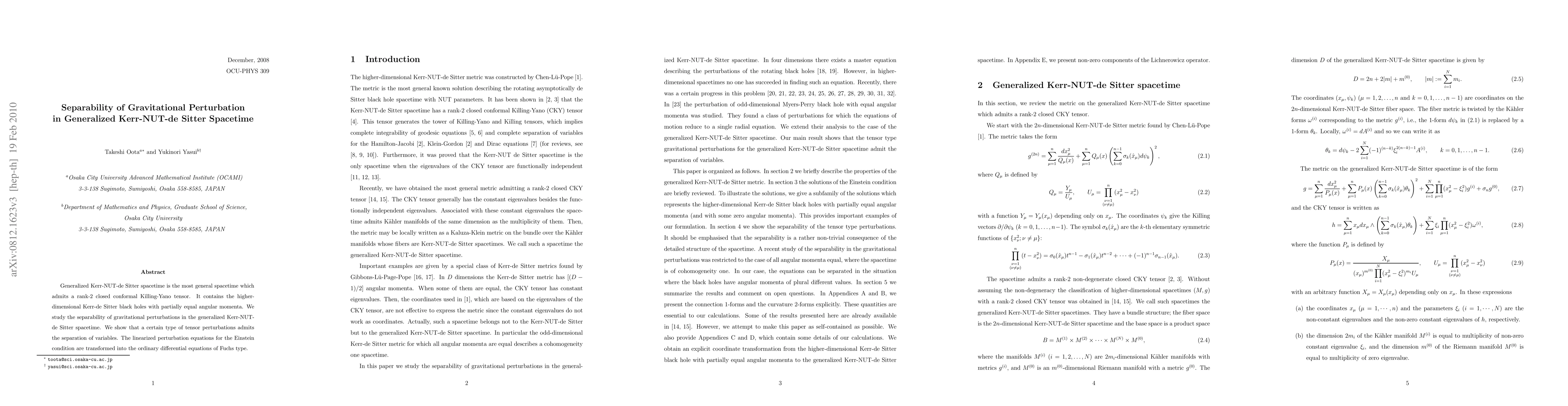 This paper investigates the separability of gravitational perturbations in generalized Kerr-NUT-de Sitter spacetime, demonstrating that certain tensor perturbations allow for variable separation. The linearized perturbation equations are transformed into Fuchs type ordinary differential equations.
