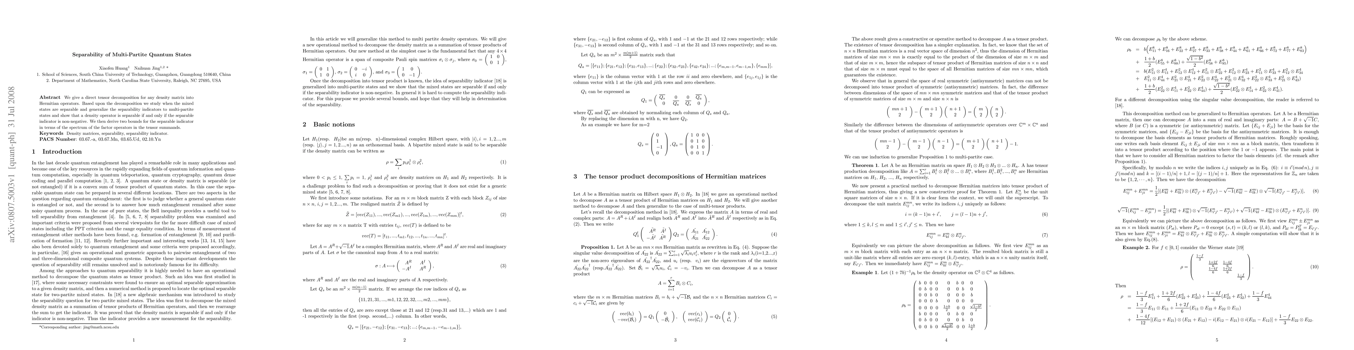 This paper presents a direct tensor decomposition method for density matrices into Hermitian operators, establishing conditions for separability of multi-partite quantum states. It shows that a density operator is separable if its separable indicator is non-negative, and derives bounds for this indicator based on the spectrum of factor operators.