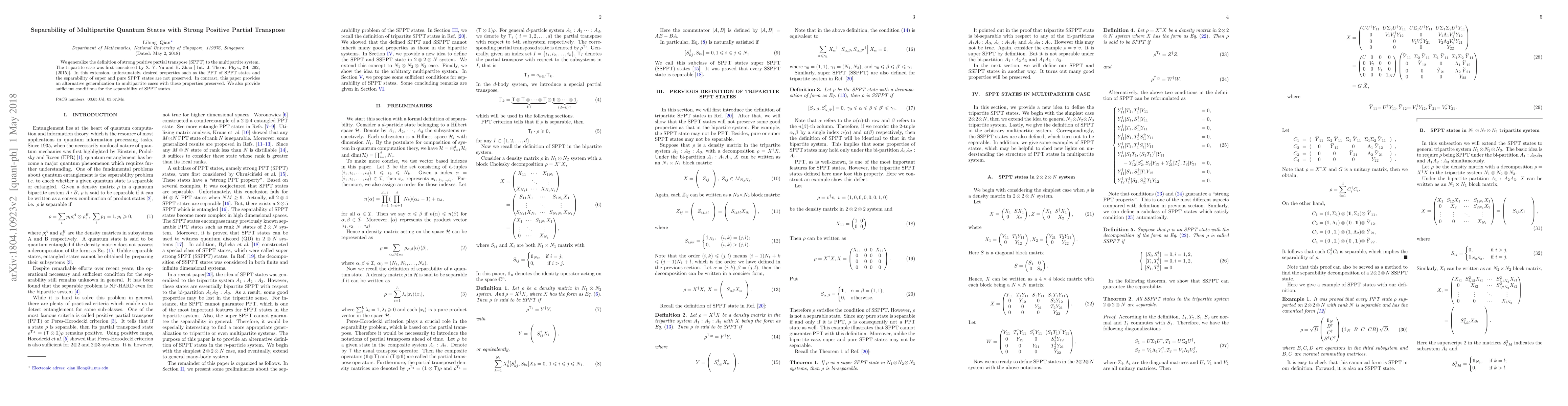 This paper generalizes the concept of strong positive partial transpose (SPPT) to multipartite quantum systems, preserving desired properties like the PPT of SPPT states. It provides sufficient conditions for the separability of these states, contrasting with previous approaches where such properties were not maintained.