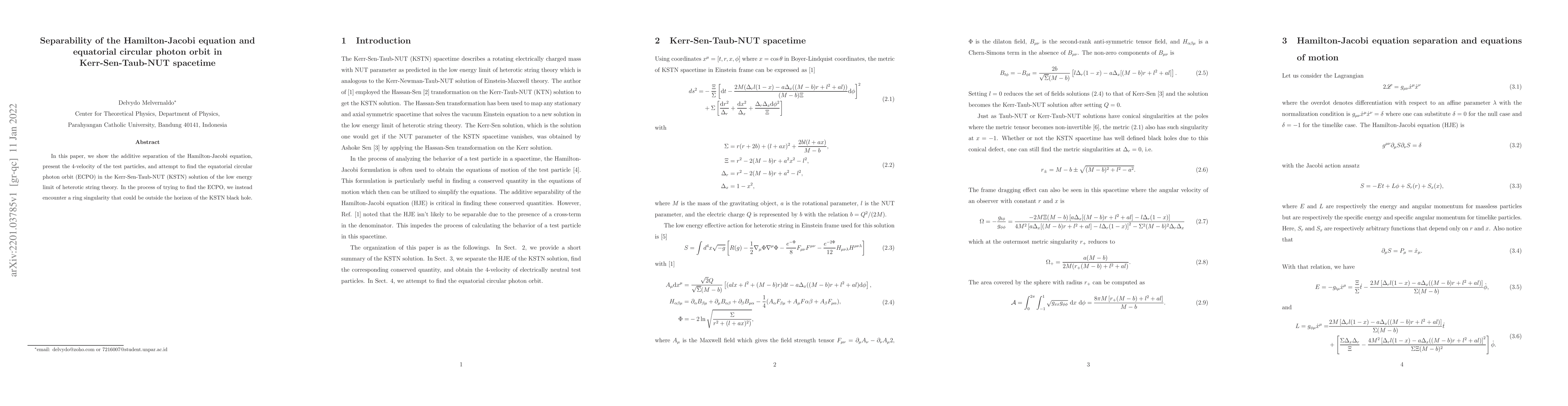 This paper demonstrates the additive separation of the Hamilton-Jacobi equation and presents the 4-velocity of test particles in the Kerr-Sen-Taub-NUT spacetime. Instead of finding the equatorial circular photon orbit, it identifies a ring singularity potentially outside the horizon of the KSTN black hole.