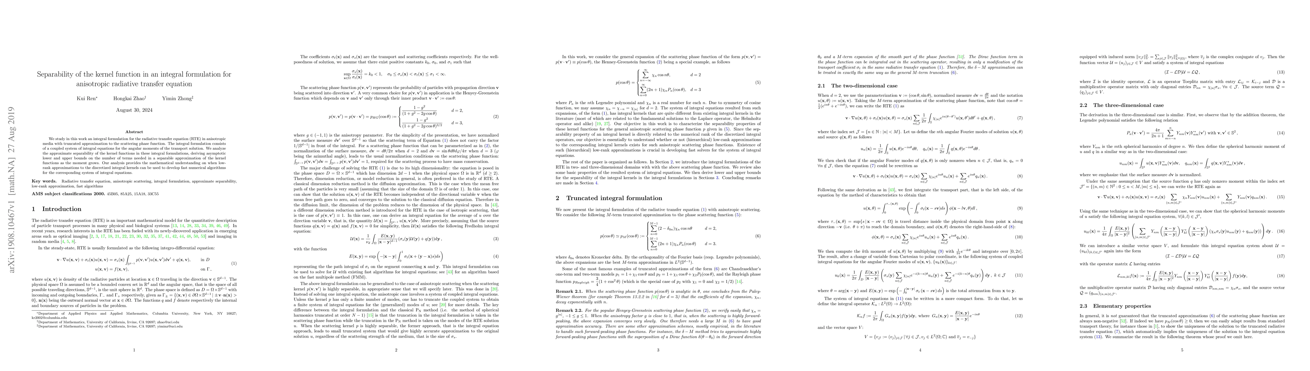 This paper investigates the integral formulation for the anisotropic radiative transfer equation, focusing on the separability of kernel functions within the coupled system of integral equations. It derives bounds on the number of terms required for separable approximations, providing insights into the use of low-rank approximations for efficient numerical algorithms.