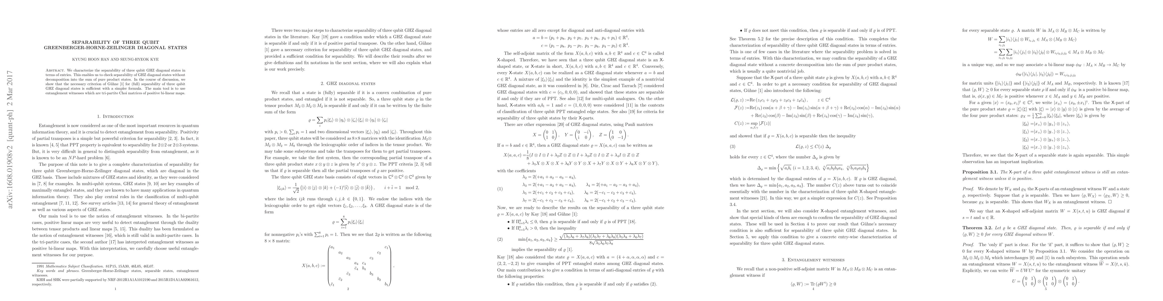 This paper investigates the separability of three-qubit Greenberger-Horne-Zeilinger (GHZ) diagonal states through direct characterization without decomposition, showing that G\"uhne's necessary criterion for full separability is also sufficient with a simplified formula, utilizing tri-partite Choi matrices of positive bi-linear maps as entanglement witnesses.