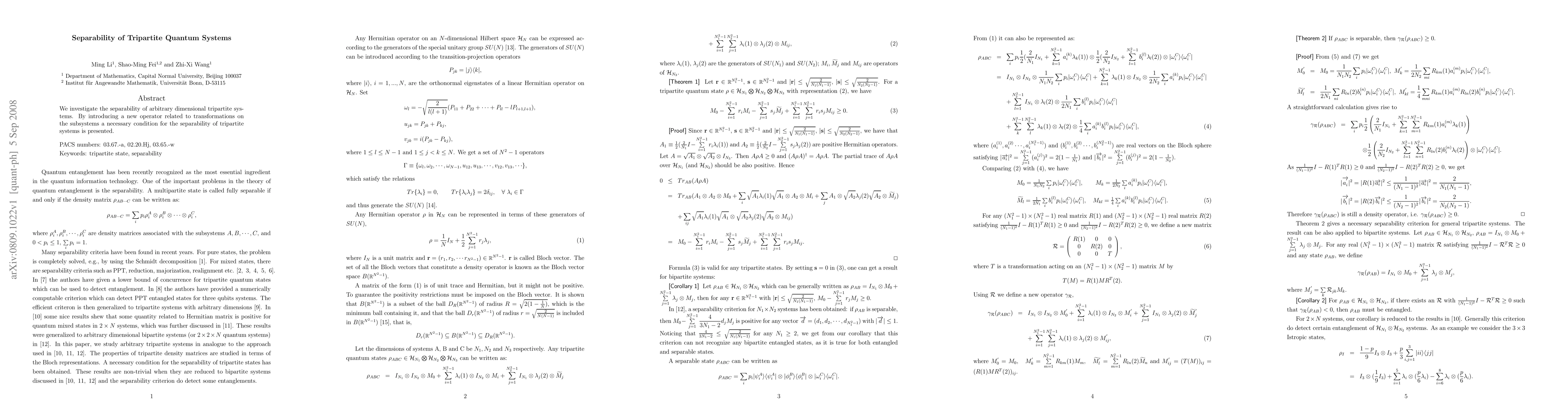 Summary: This paper explores the separability of tripartite quantum systems by introducing a new operator, presenting a necessary condition for their separability through transformations on subsystems. The focus is on arbitrary dimensional configurations.
