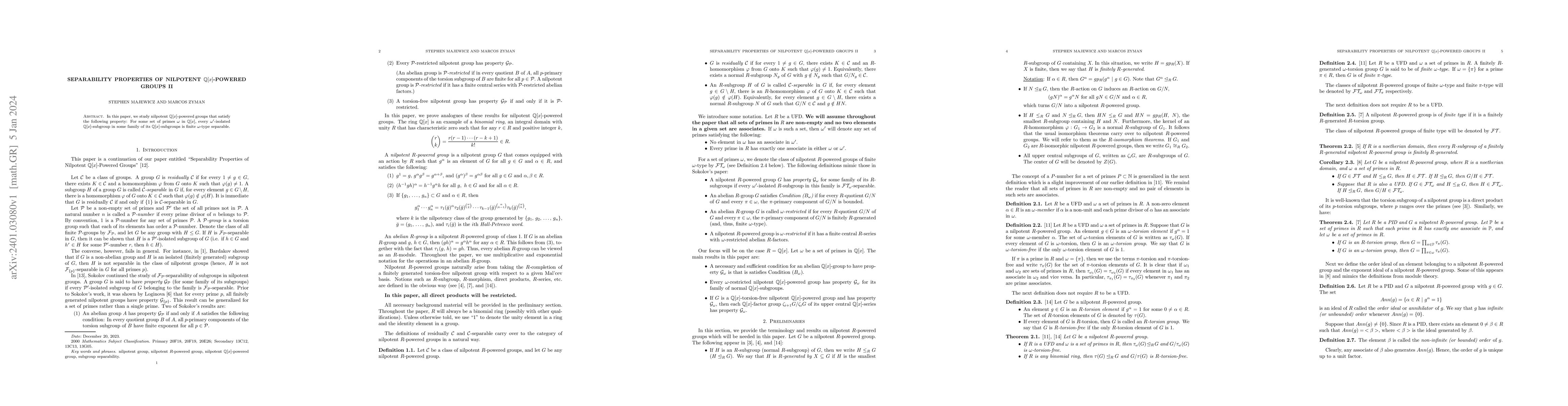 In this paper, we study nilpotent $\mathbb{Q}$$[x]$-powered groups that satisfy the following property: For some set of primes $\omega$ in $\mathbb{Q}$$[x]$, every $\omega '$-isolated $\mathbb{Q}$$[x]$-subgroup in some family of its $\mathbb{Q}$$[x]$-subgroups is finite $\omega$-type separable.