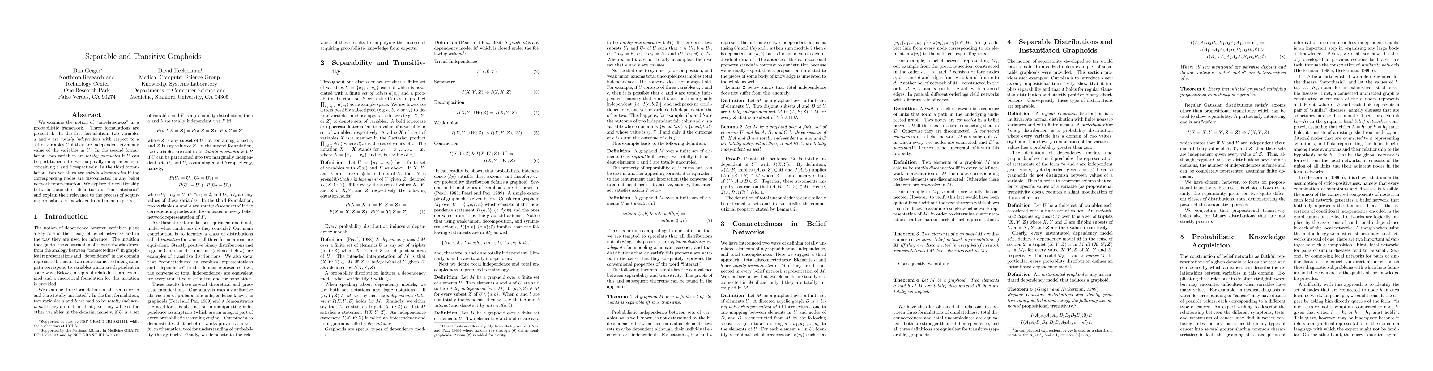 We examine three probabilistic formulations of the sentence a and b are totally unrelated with respect to a given set of variables U. First, two variables a and b are totally independent if they are independent given any value of any subset of the variables in U. Second, two variables are totally uncoupled if U can be partitioned into two marginally independent sets containing a and b respectively. Third, two variables are totally disconnected if the corresponding nodes are disconnected in every belief network representation. We explore the relationship between these three formulations of unrelatedness and explain their relevance to the process of acquiring probabilistic knowledge from human experts.