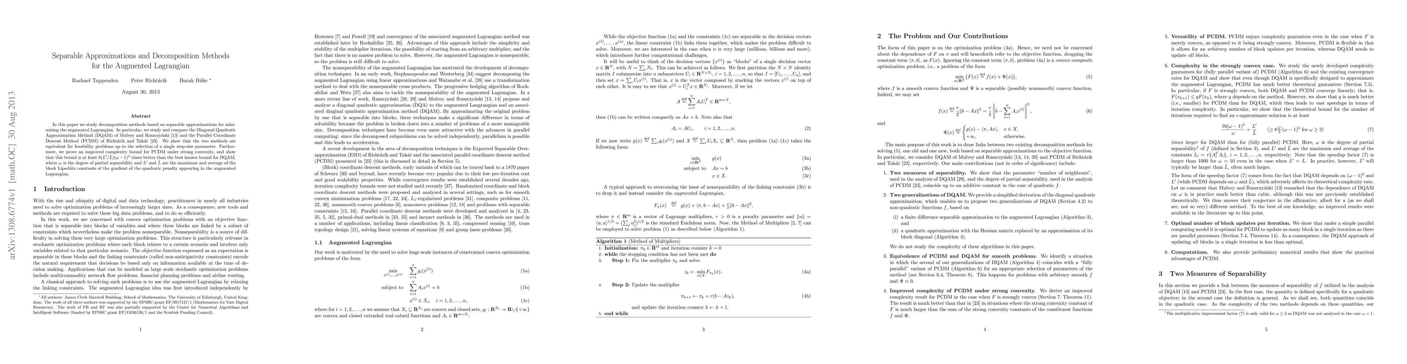 This paper compares two decomposition methods for minimizing the augmented Lagrangian: the Diagonal Quadratic Approximation Method (DQAM) and the Parallel Coordinate Descent Method (PCDM). It demonstrates their equivalence for feasibility problems and presents an improved complexity bound for PCDM under strong convexity, significantly outperforming DQAM.