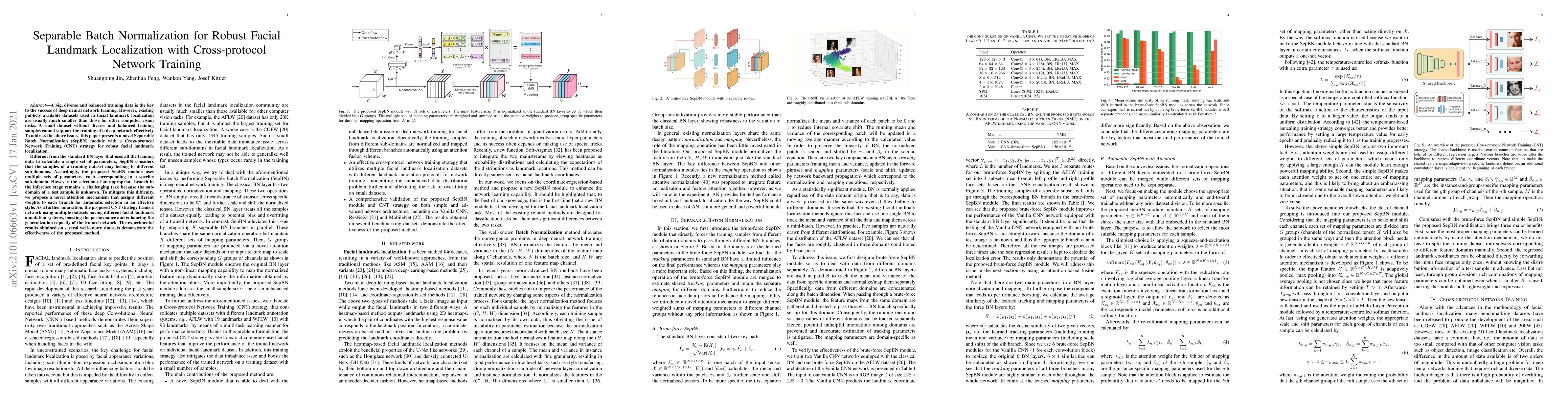 This paper introduces a Separable Batch Normalization (SepBN) module and Cross-protocol Network Training (CNT) strategy to enhance facial landmark localization using small, diverse datasets. SepBN uses multiple sets of parameters for different sub-domains, while an attention mechanism aids in branch selection during inference. CNT trains the network across multiple datasets with different annotation systems, improving performance and generalization.