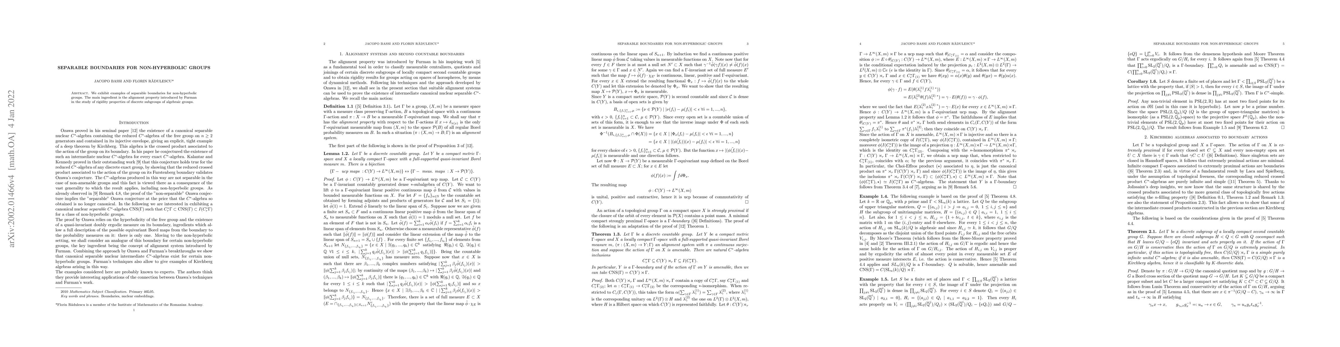 Summary: This paper presents examples of separable boundaries for non-hyperbolic groups, utilizing Furman's alignment property to explore the rigidity properties of discrete subgroups within algebraic groups. The findings contribute to the understanding of boundary behavior in non-hyperbolic settings.