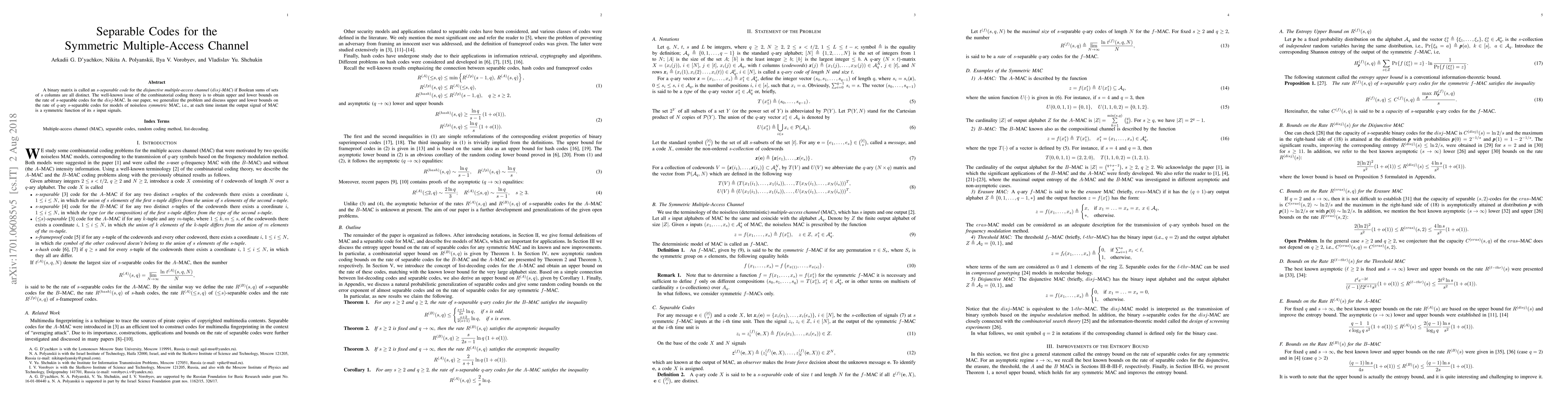 A binary matrix is called an s-separable code for the disjunctive multiple-access channel (disj-MAC) if Boolean sums of sets of s columns are all distinct. The well-known issue of the combinatorial coding theory is to obtain upper and lower bounds on the rate of s-separable codes for disj-MAC. In our paper, we generalize the problem and discuss upper and lower bounds on the rate of q-ary s-separable codes for models of noiseless symmetric MAC, i.e., when at each time instant the output signal of MAC is a symmetric function of its s input signals.