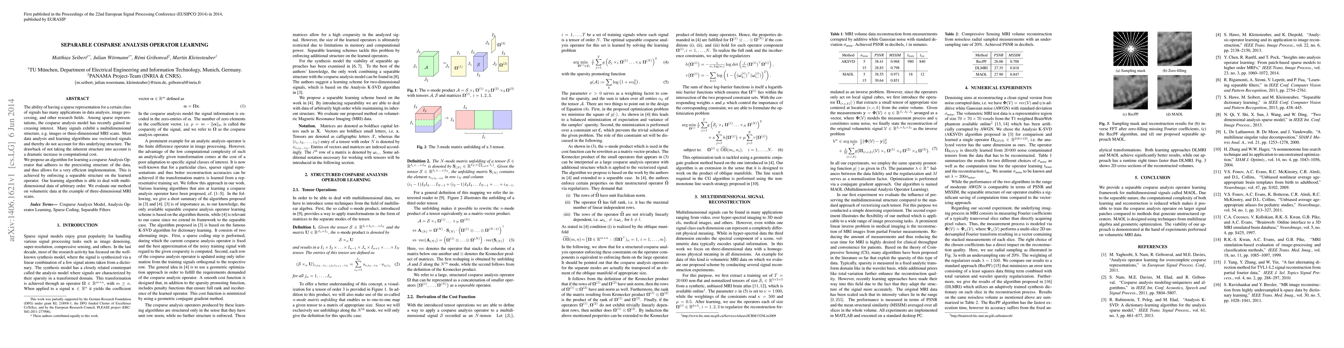 This paper proposes an efficient algorithm for learning a separable cosparse Analysis Operator that leverages the inherent multidimensional structure of data, significantly reducing computational costs. The method is evaluated on three-dimensional MRI scans, demonstrating its effectiveness for volumetric data analysis.