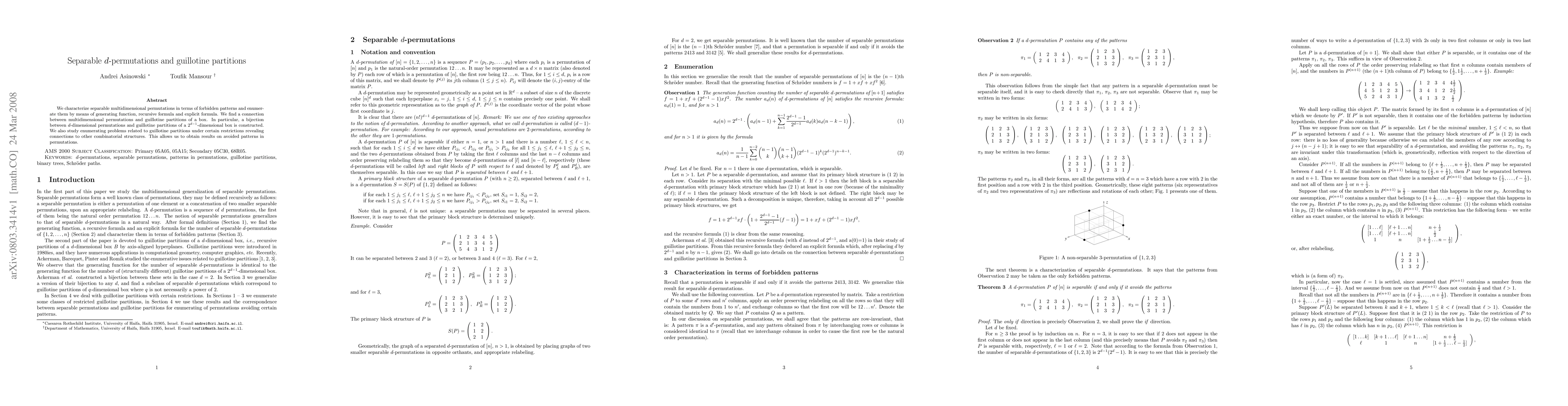 This paper characterizes separable multidimensional permutations through forbidden patterns and enumerates them using generating functions, recursive, and explicit formulas. It establishes a connection between these permutations and guillotine partitions, constructing a bijection between $d$-dimensional permutations and $2^{d-1}$-dimensional guillotine partitions.