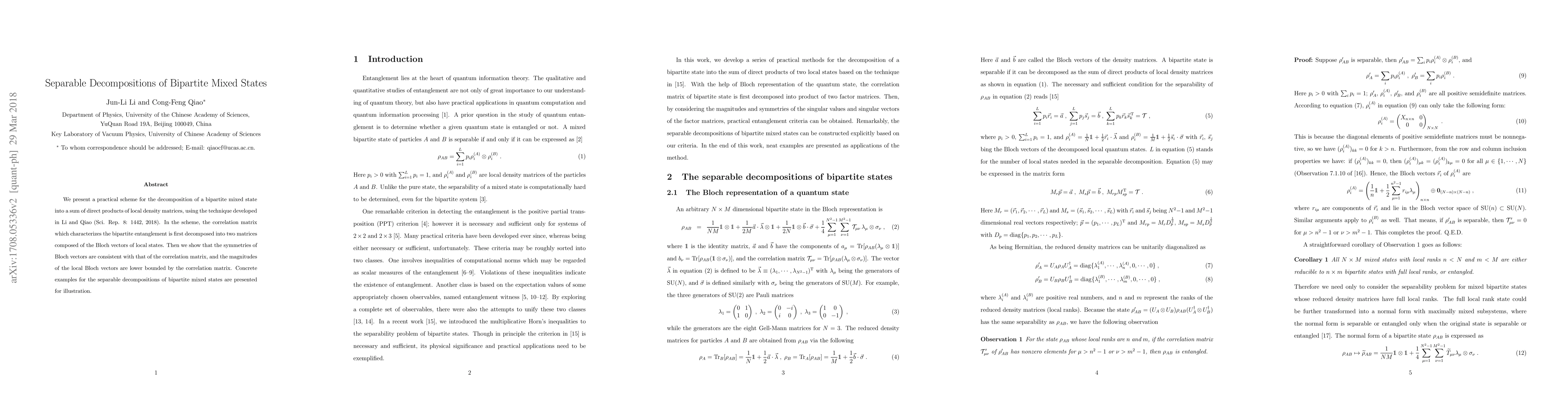 This paper proposes a method for decomposing bipartite mixed states into sums of local density matrices, utilizing the technique from Li and Qiao. It demonstrates that the correlation matrix's symmetries and magnitudes align with those of the local Bloch vectors, providing concrete examples for illustration.