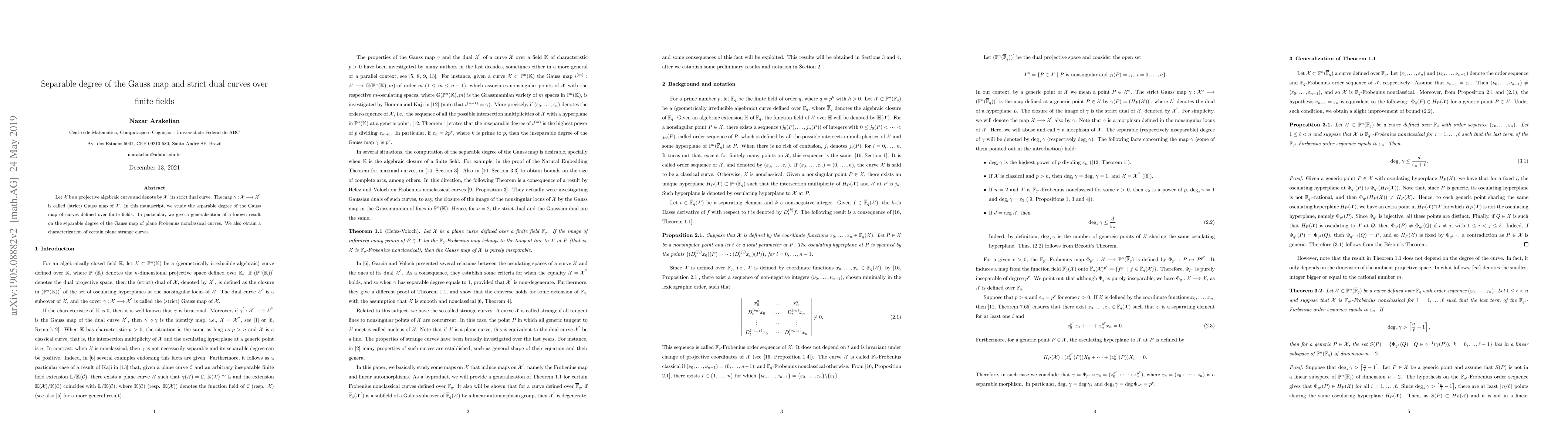 Let $\mathcal{X}$ be a projective algebraic curve and denote by $\mathcal{X}^{'}$ its strict dual curve. The map $\gamma:\mathcal{X} \longrightarrow \mathcal{X}^{'}$ is called (strict) Gauss map of $\mathcal{X}$. In this manuscript, we study the separable degree of the Gauss map of curves defined over finite fields. In particular, we give a generalization of a known result on the separable degree of the Gauss map of plane Frobenius nonclassical curves. We also obtain a characterization of certain plane strange curves.