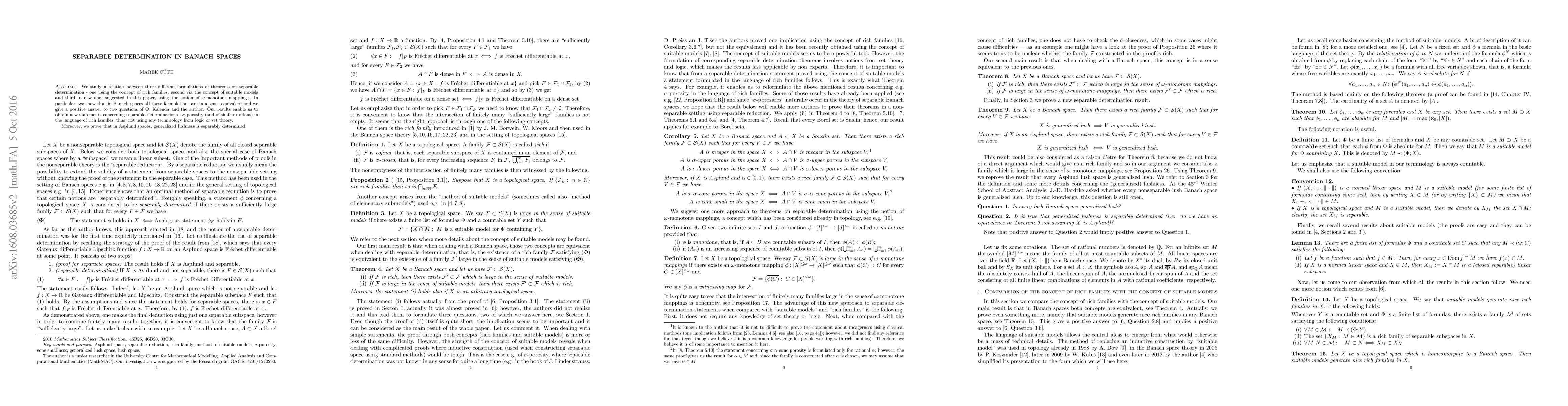 We study a relation between three different formulations of theorems on separable determination - one using the concept of rich families, second via the concept of suitable models and third, a new one, suggested in this paper, using the notion of $\omega$-monotone mappings. In particular, we show that in Banach spaces all those formulations are in a sense equivalent and we give a positive answer to two questions of O. Kalenda and the author. Our results enable us to obtain new statements concerning separable determination of $\sigma$-porosity (and of similar notions) in the language of rich families; thus, not using any terminology from logic or set theory. Moreover, we prove that in Asplund spaces, generalized lushness is separably determined.