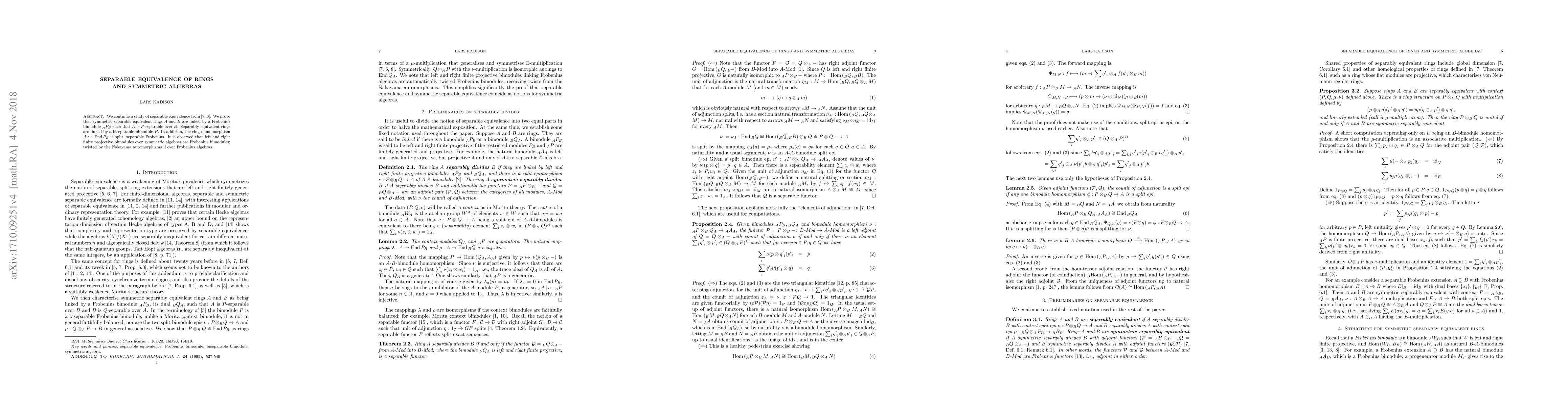 This paper proves that separable equivalence between symmetric separable rings $A$ and $B$ is mediated by a Frobenius bimodule ${}_AP_B$, making $A$ $P$-separable over $B$. It also establishes that such equivalences involve biseparable bimodules $P$ and that the ring extension $A \rightarrow$ End $P_B$ is a separable Frobenius extension.