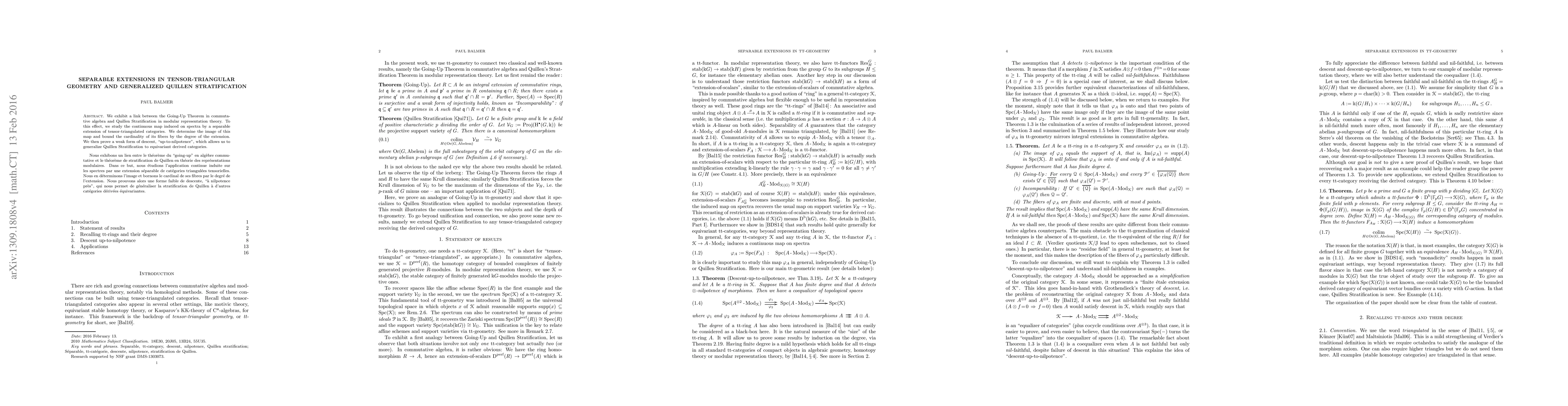 This paper investigates the behavior of spectra under separable extensions in tensor-triangulated categories, determining the image and fiber cardinalities. It also extends Quillen's Stratification Theorem to equivariant derived categories via a 'weak descent' principle, named 'up-to-nilpotence'.