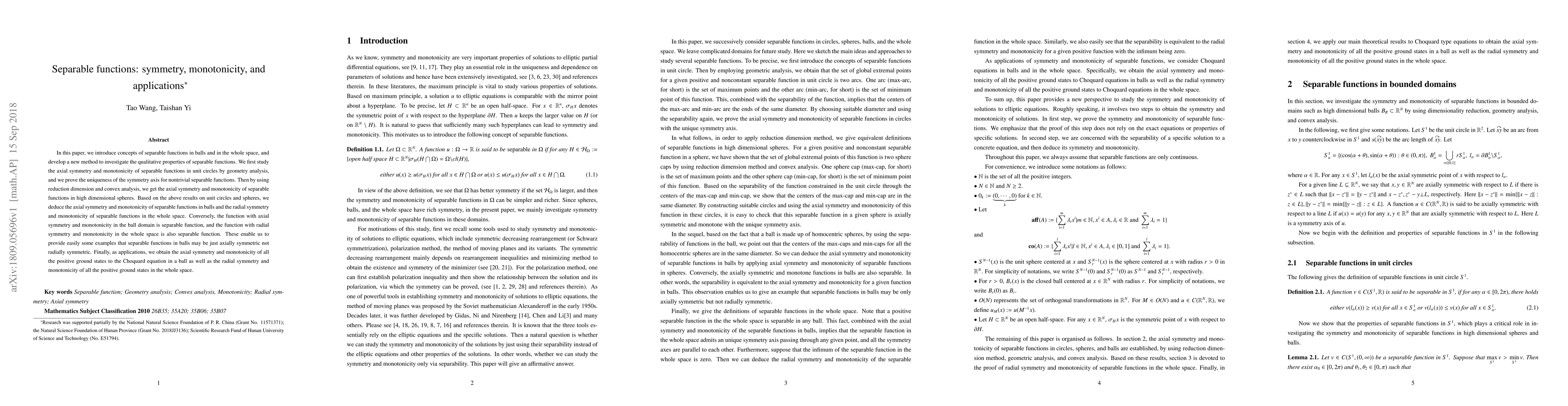 This paper develops a new method to investigate the axial symmetry and monotonicity of separable functions, proving their uniqueness and extending these properties from unit circles and spheres to balls and the whole space. Applications include the symmetry and monotonicity of positive ground states to the Choquard equation.