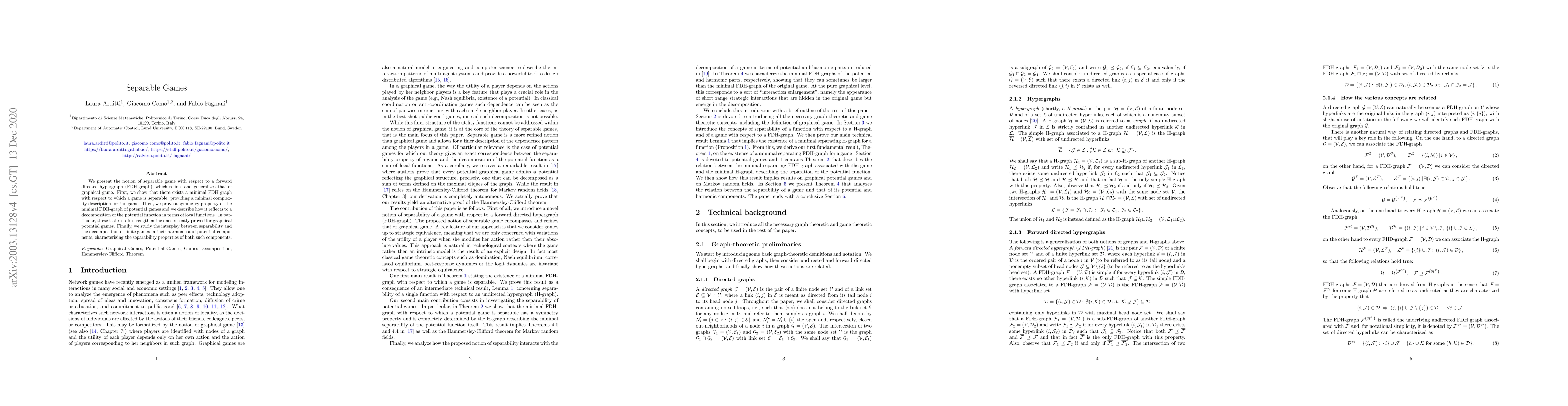 We present the notion of separable game with respect to a forward directed hypergraph (FDH-graph), which refines and generalizes that of graphical game. First, we show that there exists a minimal FDH-graph with respect to which a game is separable, providing a minimal complexity description for the game. Then, we prove a symmetry property of the minimal FDH-graph of potential games and we describe how it reflects to a decomposition of the potential function in terms of local functions. In particular, these last results strengthen the ones recently proved for graphical potential games. Finally, we study the interplay between separability and the decomposition of finite games in their harmonic and potential components, characterizing the separability properties of both such components.