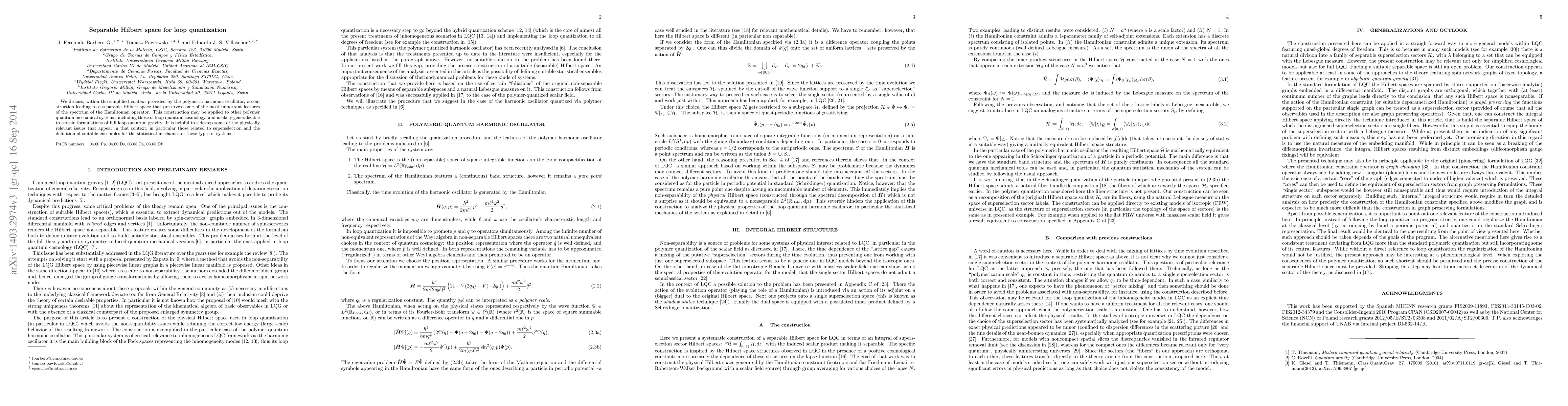 This paper constructs a separable Hilbert space for loop quantization using the polymeric harmonic oscillator, preserving key features of the Hamiltonian spectrum. The approach is generalizable to other polymer quantum systems and loop quantum gravity, while avoiding complex superselection issues.