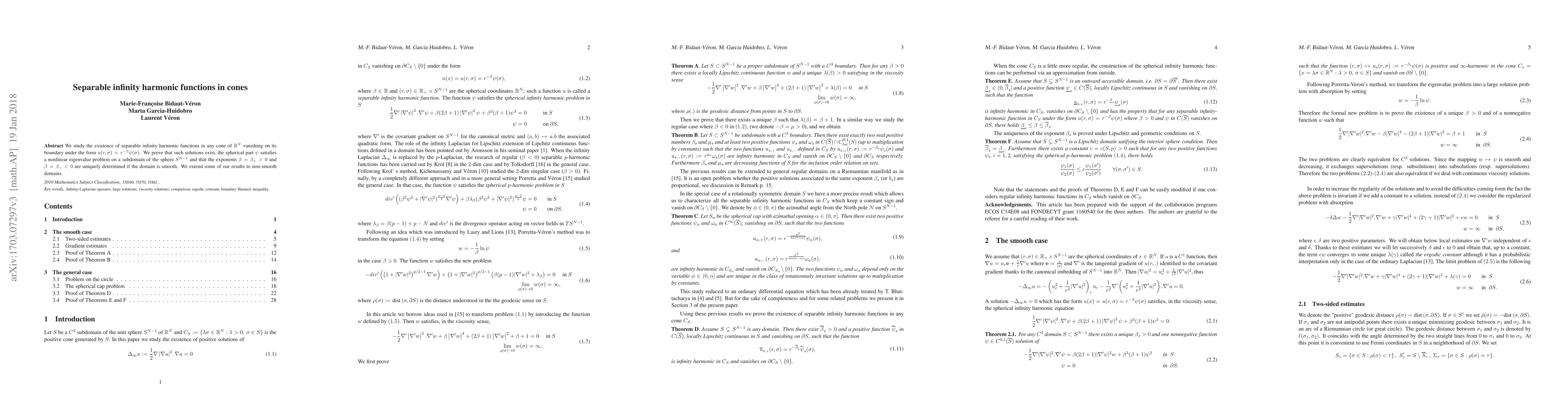 This paper proves the existence of separable infinite harmonic functions in cones of R^N that vanish on the boundary, where the functions take the form u(r, σ) = r^-βω(σ). It shows that the spherical part ω satisfies a nonlinear eigenvalue problem and determines the unique exponents β+ and β- for smooth domains.