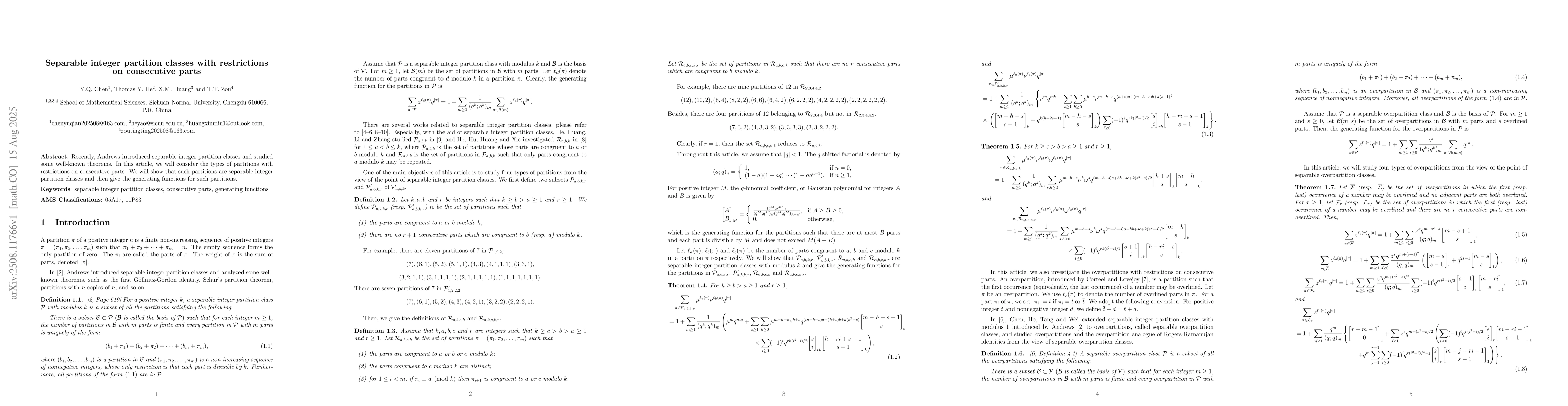 The paper studies separable integer partition classes with restrictions on consecutive parts, introducing generating functions for such partitions and proving theorems about their structures.