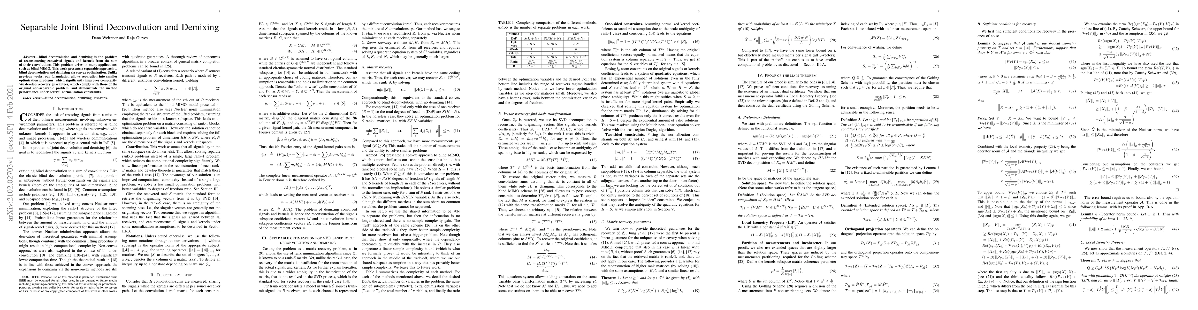 This paper proposes a separable convex optimization approach for blind deconvolution and demixing, significantly reducing complexity compared to non-separable methods while maintaining recovery guarantees. The method is demonstrated to perform well under various normalization constraints.