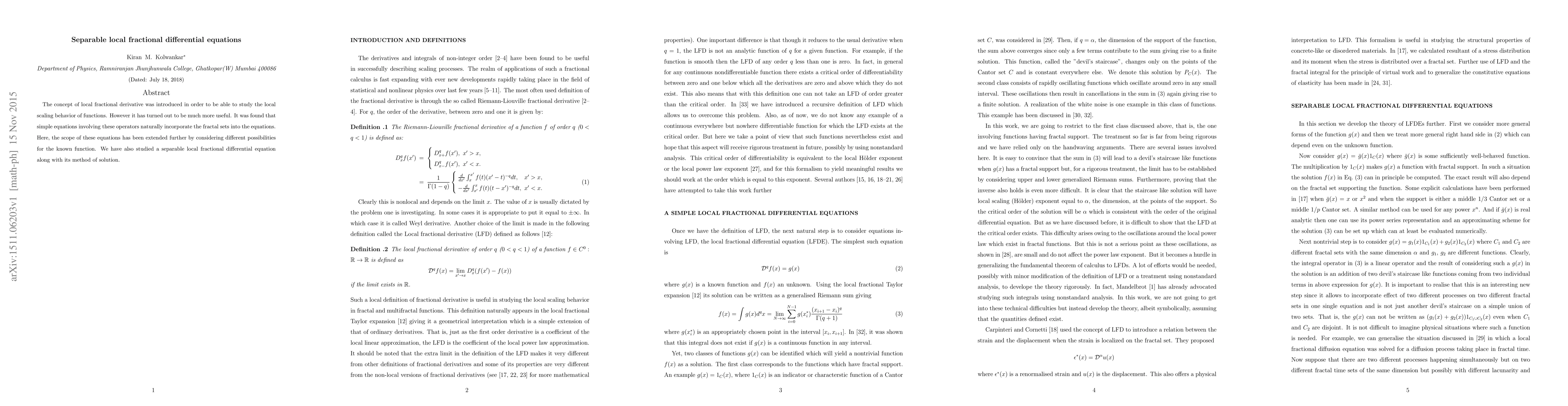 The concept of local fractional derivative was introduced in order to be able to study the local scaling behavior of functions. However it has turned out to be much more useful. It was found that simple equations involving these operators naturally incorporate the fractal sets into the equations. Here, the scope of these equations has been extended further by considering different possibilities for the known function. We have also studied a separable local fractional differential equation along with its method of solution.