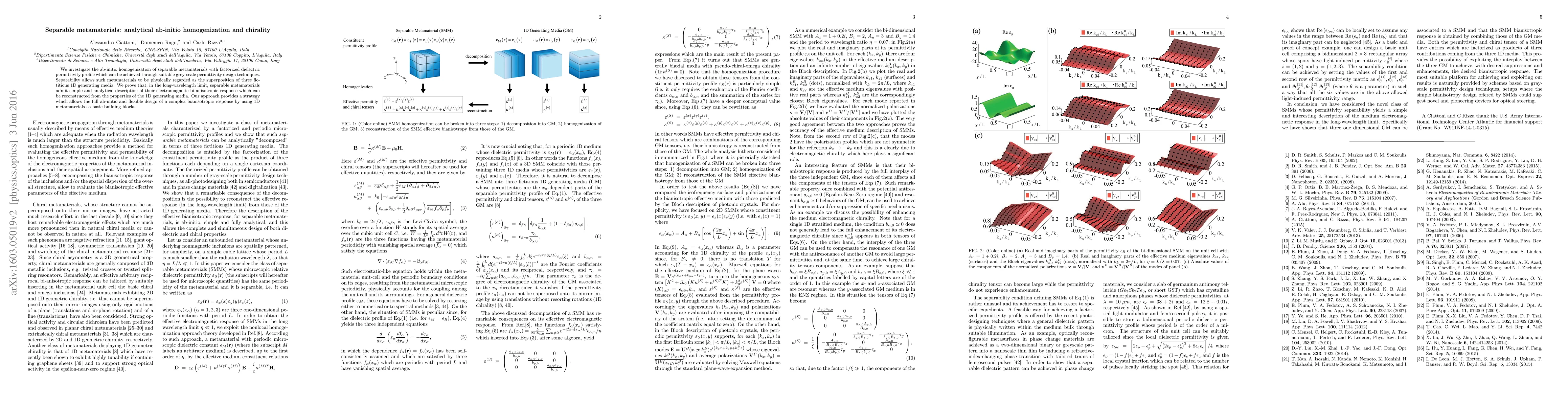 This paper investigates the ab-initio homogenization of separable metamaterials, which are characterized by a factorized dielectric permittivity profile. It demonstrates that these materials can be analytically described as the superposition of three fictitious 1D generating media, enabling flexible and ab-initio design of complex bianisotropic responses.