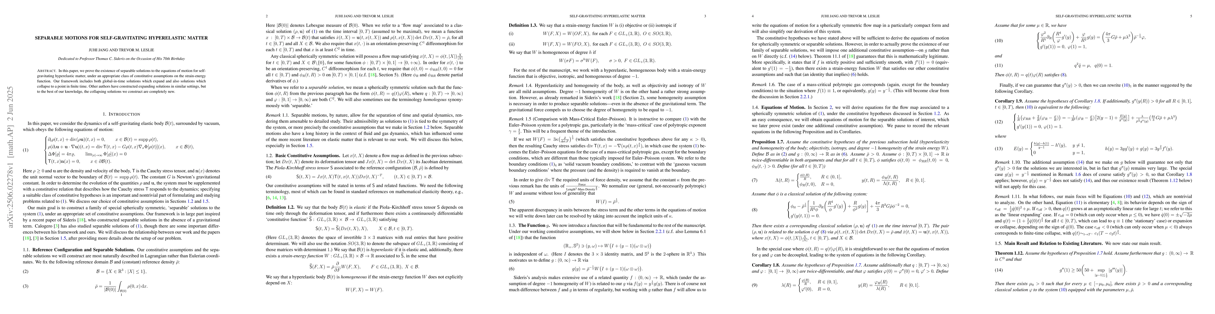 Researchers prove the existence of separable solutions for self-gravitating hyperelastic matter, including expanding and collapsing motions, under specific constitutive assumptions.
