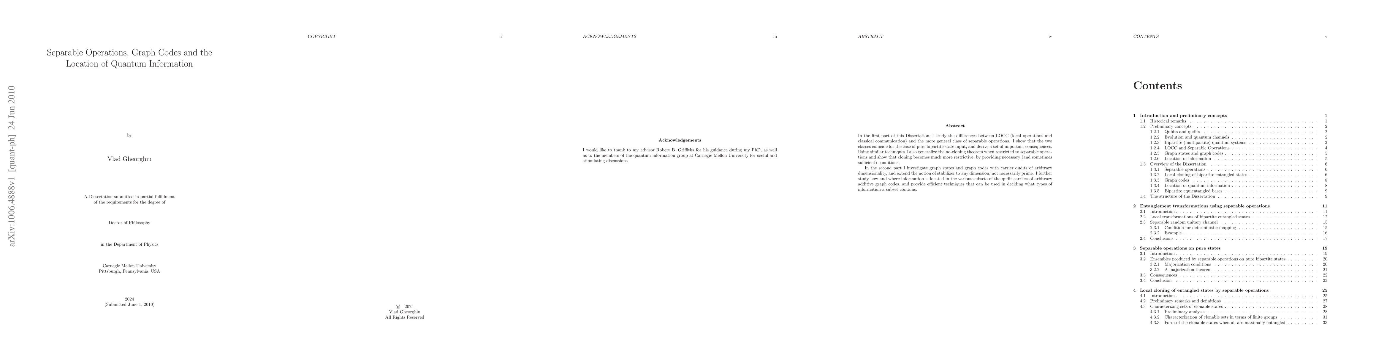 In the first part of this Dissertation, I study the differences between LOCC (local operations and classical communication) and the more general class of separable operations. I show that the two classes coincide for the case of pure bipartite state input, and derive a set of important consequences. Using similar techniques I also generalize the no-cloning theorem when restricted to separable operations and show that cloning becomes much more restrictive, by providing necessary (and sometimes sufficient) conditions. In the second part I investigate graph states and graph codes with carrier qudits of arbitrary dimensionality, and extend the notion of stabilizer to any dimension, not necessarily prime. I further study how and where information is located in the various subsets of the qudit carriers of arbitrary additive graph codes, and provide efficient techniques that can be used in deciding what types of information a subset contains.