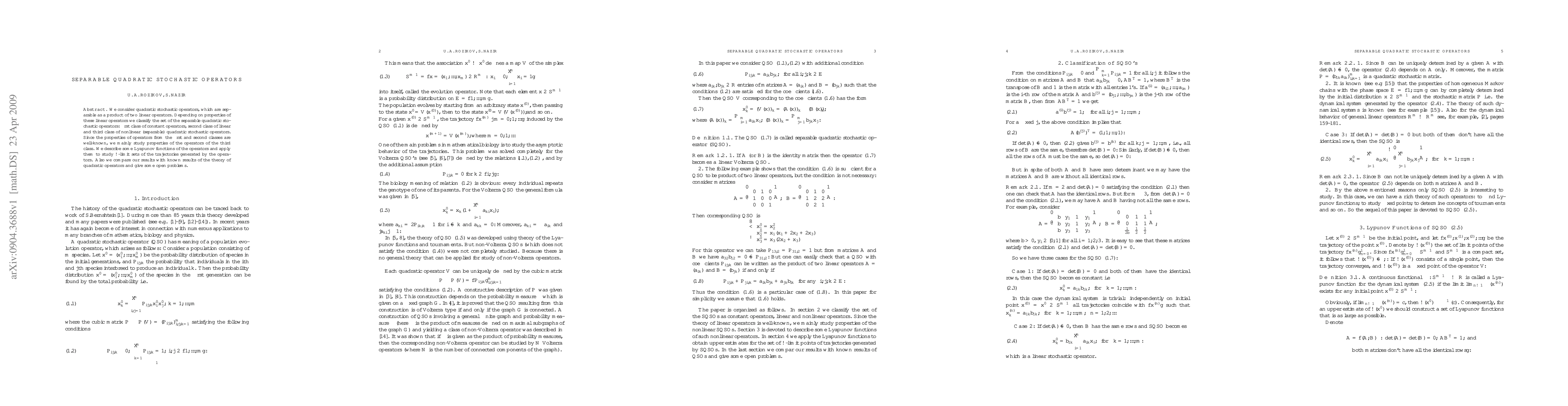 This paper explores separable quadratic stochastic operators, classifying them into constant, linear, and nonlinear types. It focuses on the nonlinear class, analyzing Lyapunov functions and their applications to $\omega$-limit sets, and compares findings with existing theories while highlighting open research questions.