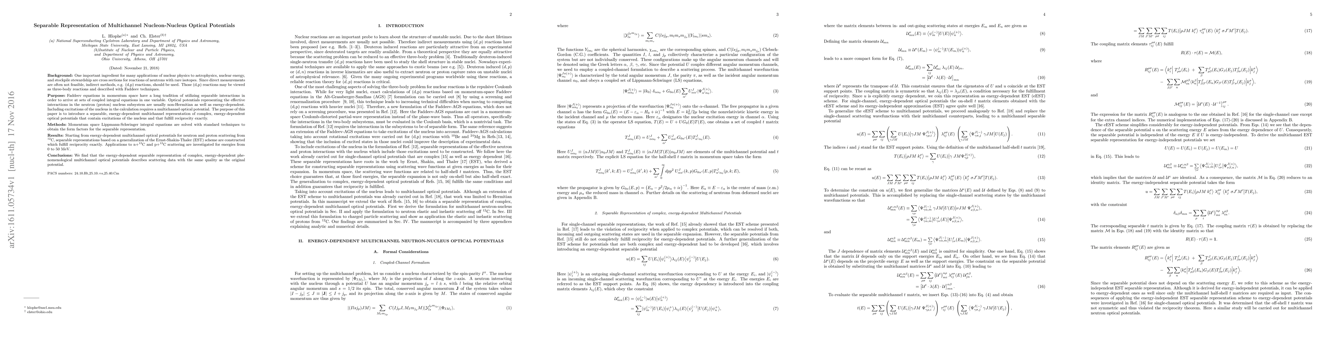 One important ingredient for many applications of nuclear physics to astrophysics, nuclear energy, and stockpile stewardship are cross sections for reactions of neutrons with rare isotopes. Since direct measurements are often not feasible, indirect methods, e.g. (d,p) reactions, should be used. Those (d,p) reactions may be viewed as three-body reactions and described with Faddeev techniques. Faddeev equations in momentum space have a long tradition of utilizing separable interactions in order to arrive at sets of coupled integral equations in one variable. Optical potentials representing the effective interactions in the neutron (proton) nucleus subsystem are usually non-Hermitian as well as energy-dependent. Including excitations of the nucleus in the calculation requires a multichannel optical potential. The purpose of this paper is to introduce a separable, energy-dependent multichannel representation of complex, energy-dependent optical potentials that contain excitations of the nucleus and that fulfill reciprocity exactly. Momentum space Lippmann-Schwinger integral equations are solved with standard techniques to obtain the form factors for the separable representation. Starting from energy-dependent multichannel optical potentials for neutron and proton scattering from $^{12}$C, separable representations based on a generalization of the Ernst-Shakin-Thaler (EST) scheme are constructed which fulfill reciprocity exactly. Applications to n$+^{12}$C and p$+^{12}$C scattering are investigated for energies from 0 to 50~MeV.